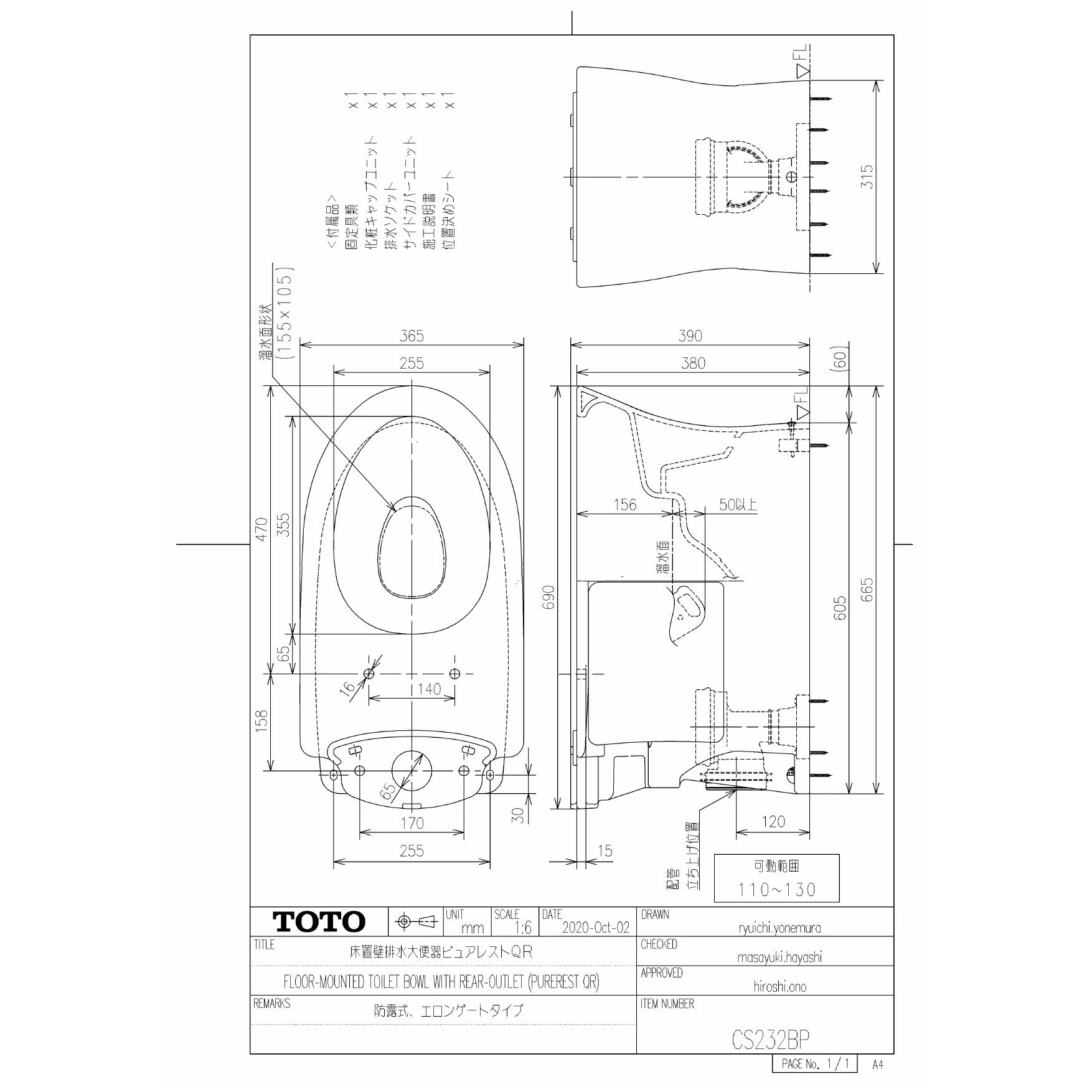 TOTO CS232BP+SH233BAK+TCF6554AK ピュアレストQR+ウォシュレットSS3A 取扱説明書 商品図面 施工説明書 分解図