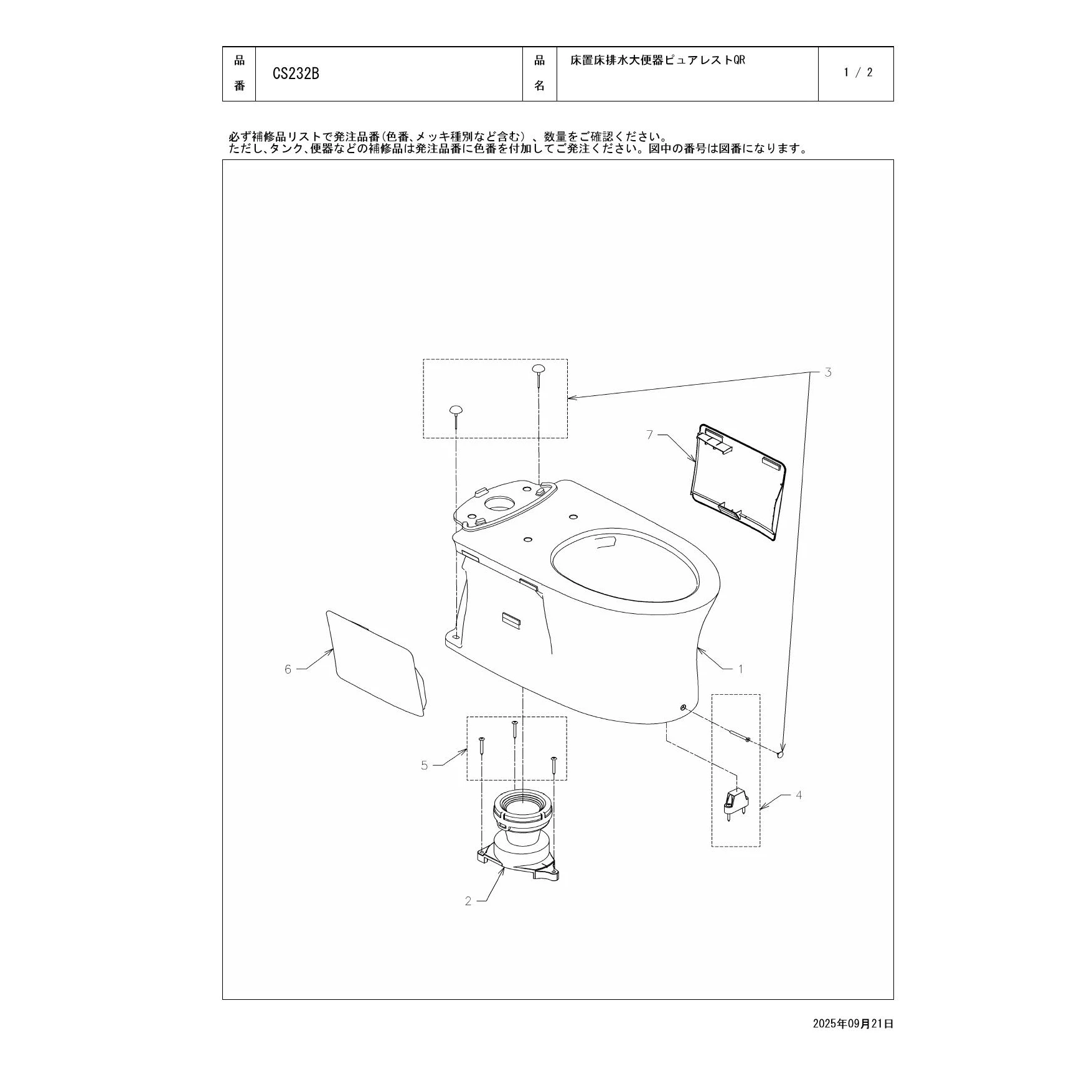 CS232B 床置床排水大便器ピュアレストQR分解図