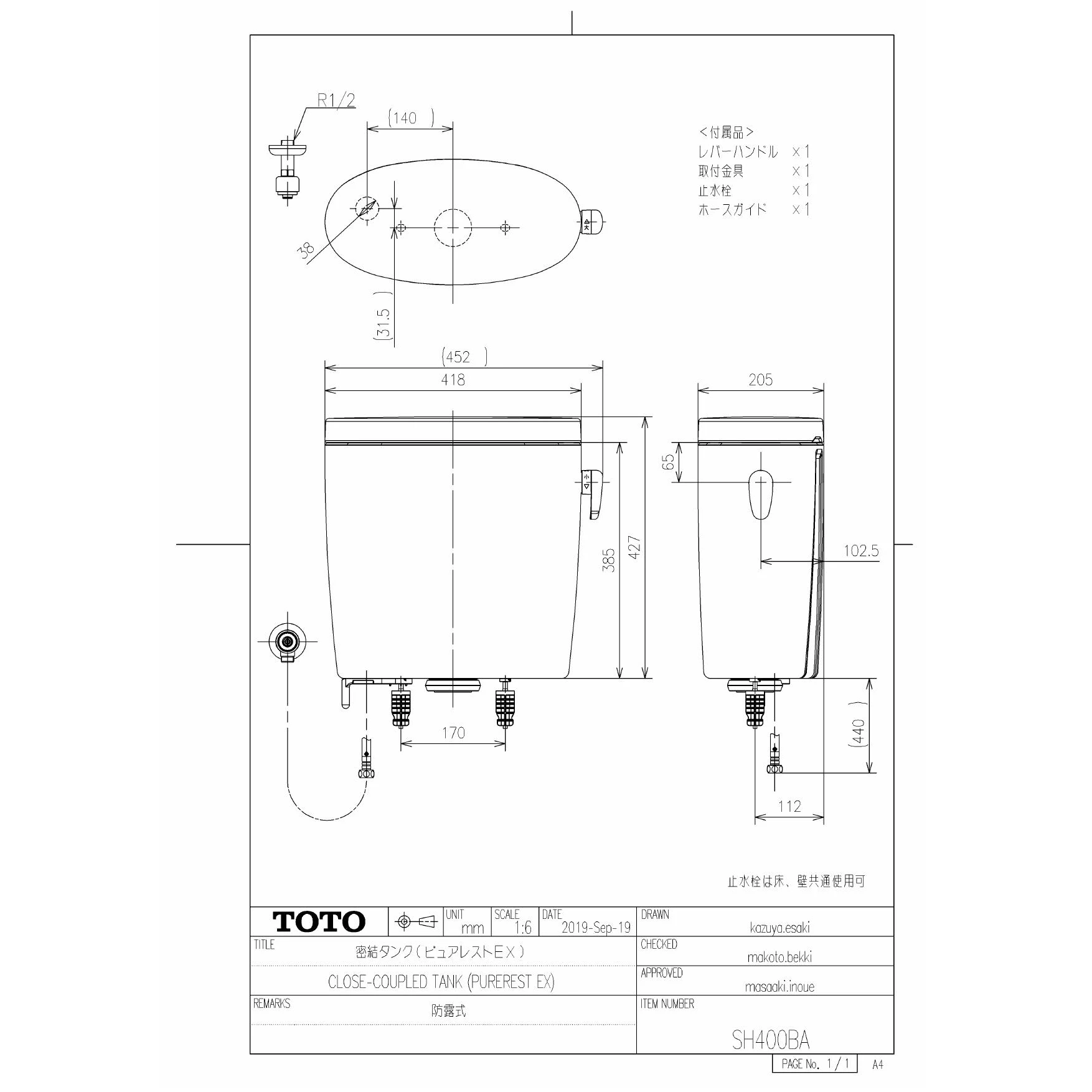 SH400BA 密結タンク(ピュアレストEX)商品図面