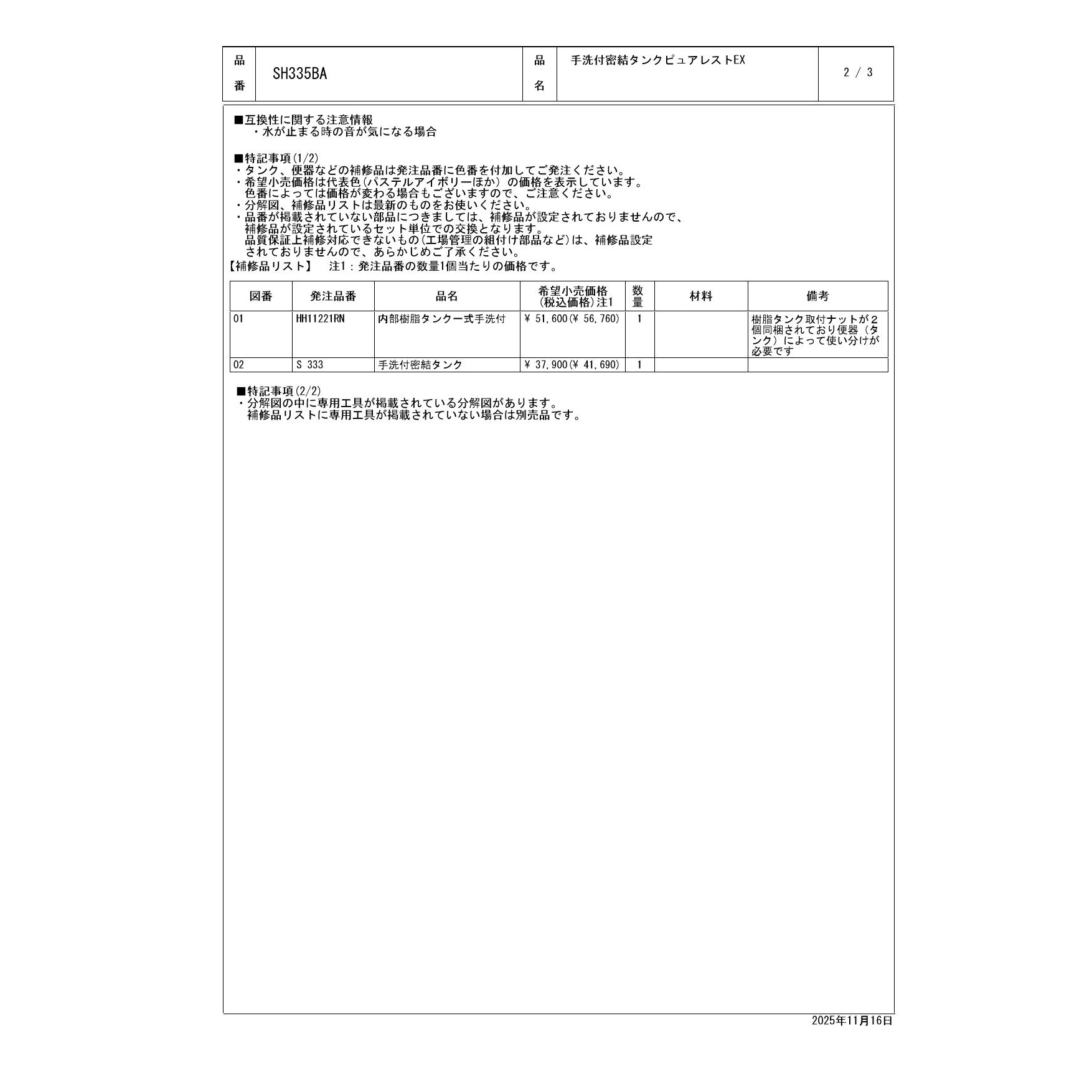 SH335BA 手洗付密結タンクピュアレストEX施工説明書