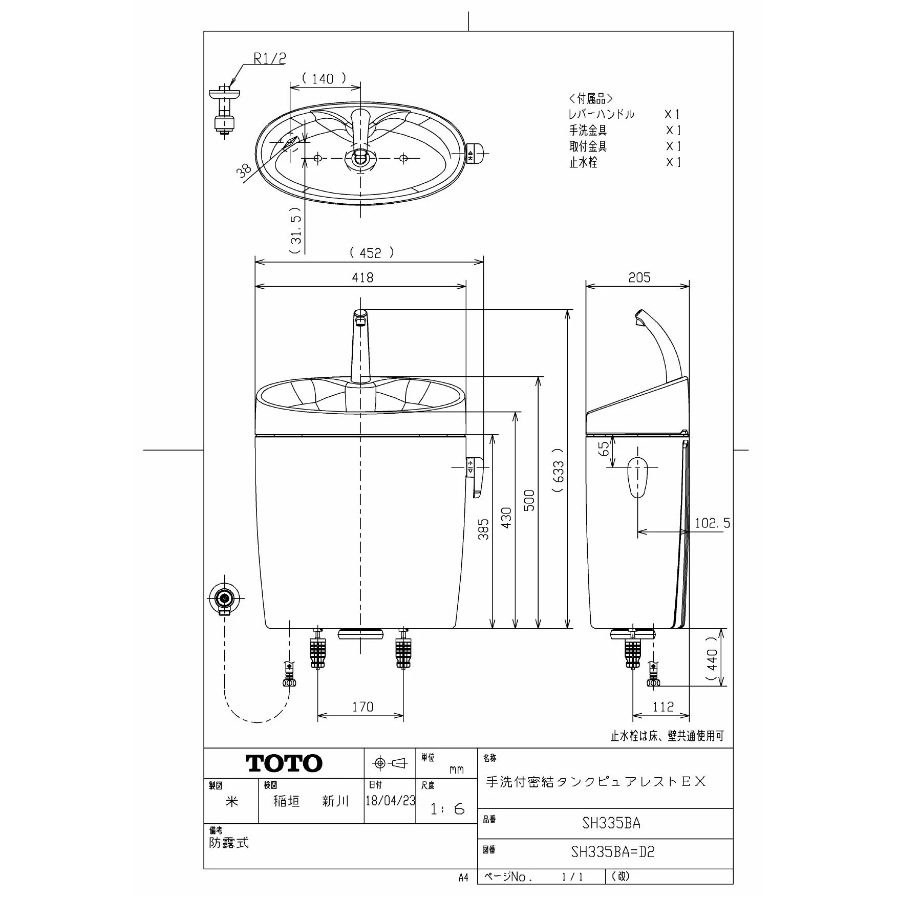 SH335BA 手洗付密結タンクピュアレストEX商品図面