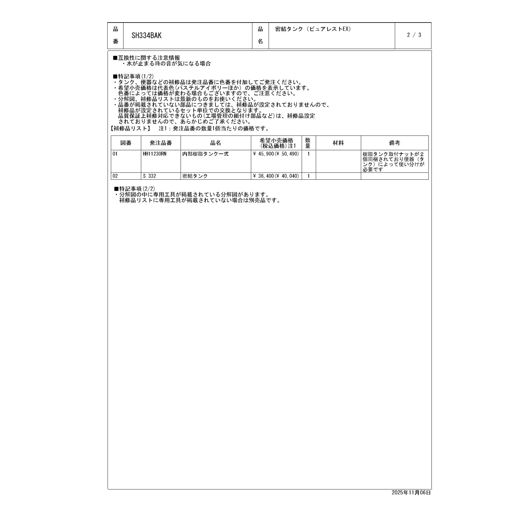 SH334BAK 密結タンク(ピュアレストEX)取扱説明書