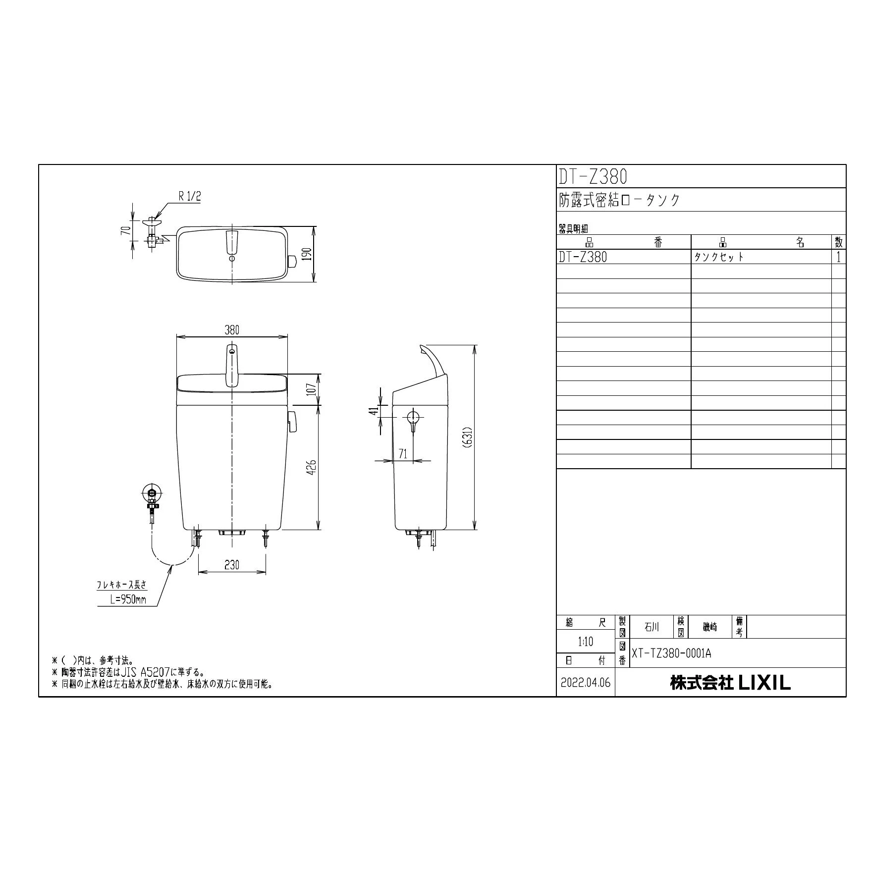DT-Z380 防露式密結ロータンク商品図面