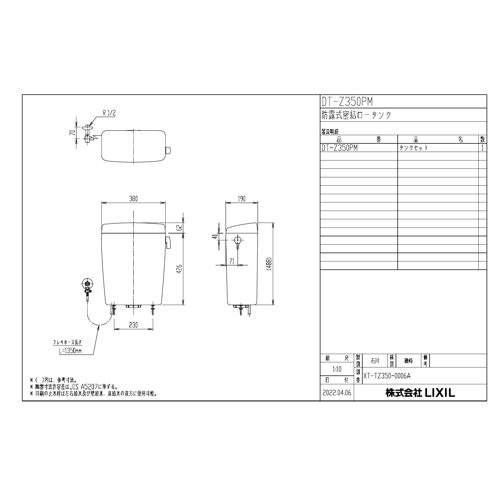 DT-Z350PM 防露式密結ロータンク商品図面