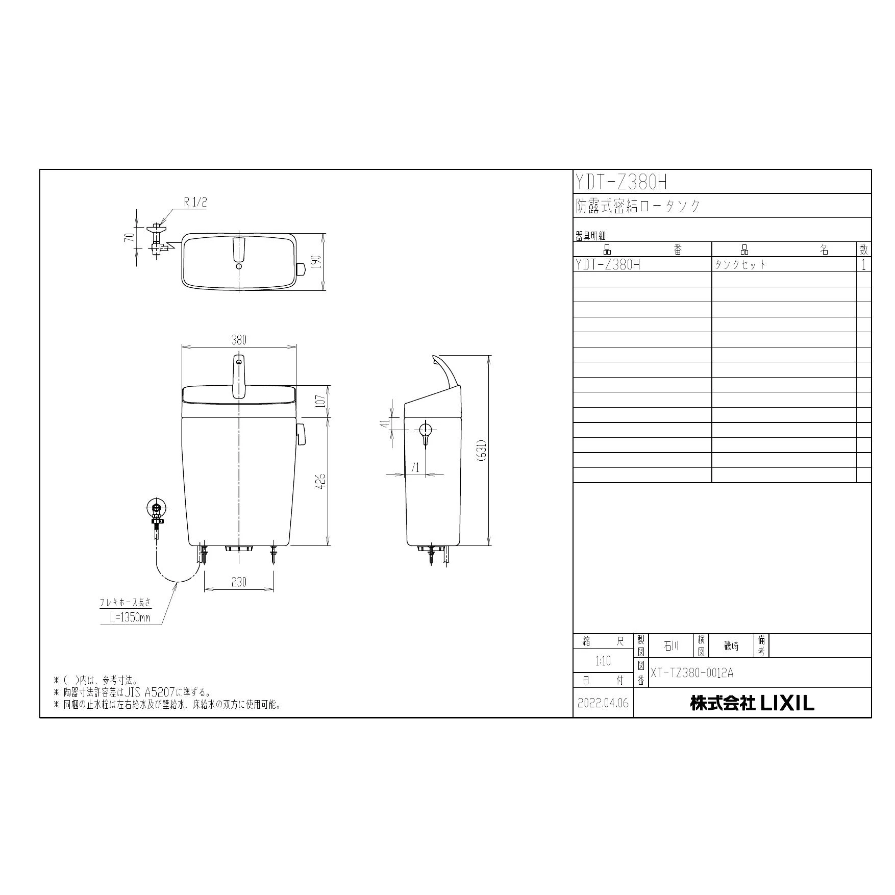 YDT-Z380H 防露式密結ロータンク商品図面