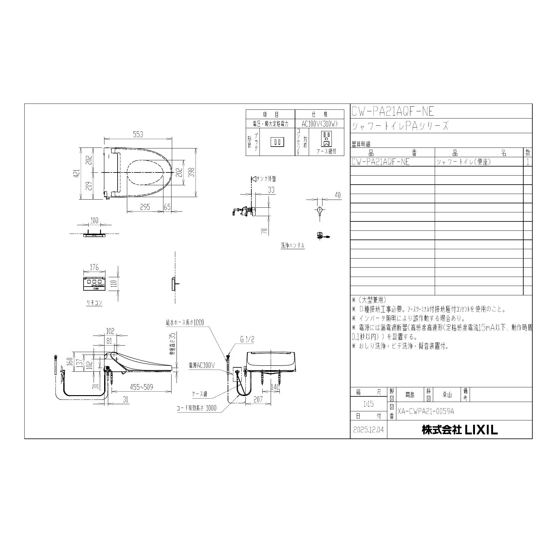 LIXIL(リクシル) CW-PA21AQF-NE シャワートイレPAシリーズ 取扱説明書 商品図面 施工説明書