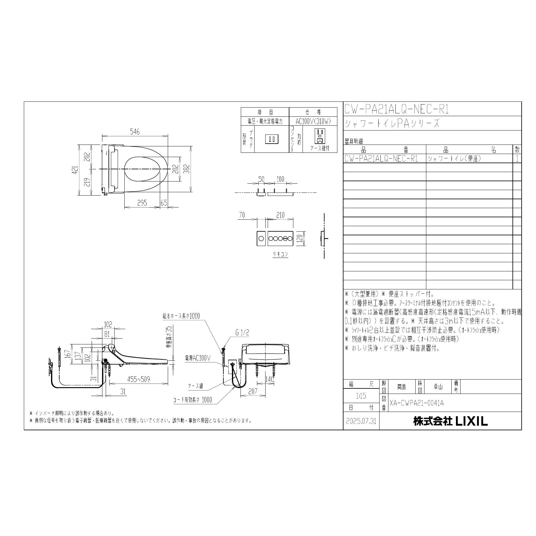 LIXIL(リクシル) CW-PA21ALQ-NEC-R1 シャワートイレPAシリーズ 便フタなし仕様 取扱説明書 商品図面 施工説明書