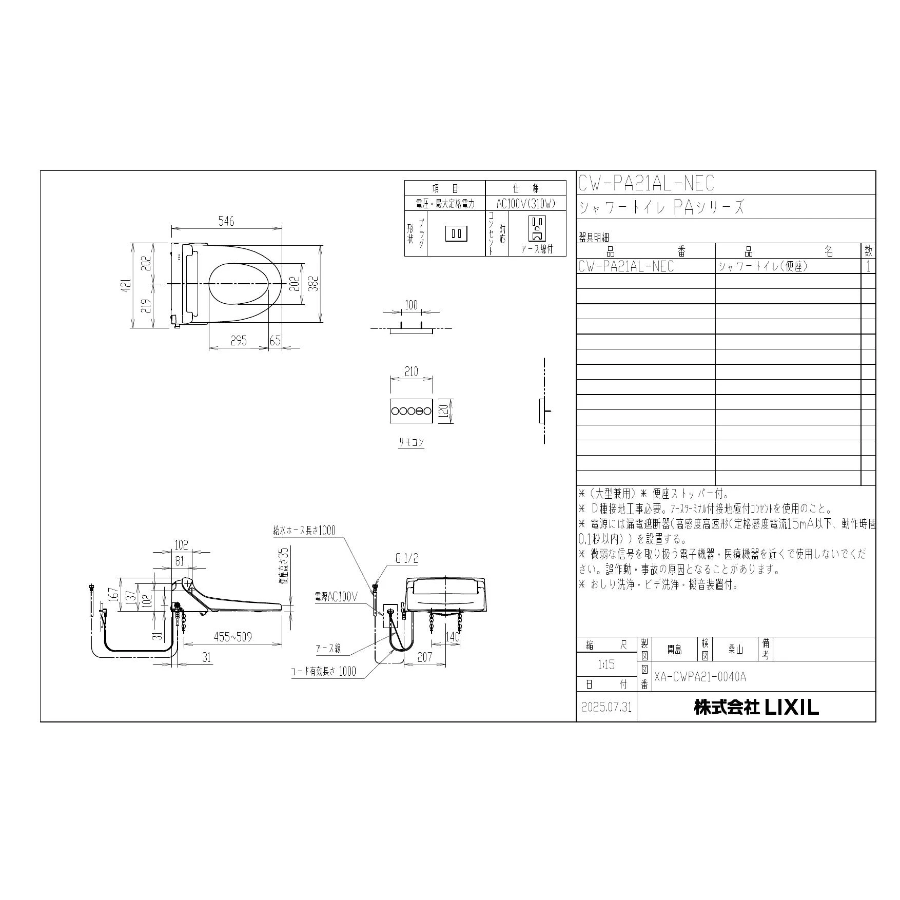 LIXIL(リクシル) CW-PA21AL-NEC シャワートイレPAシリーズ 便フタなし仕様 取扱説明書 商品図面 施工説明書